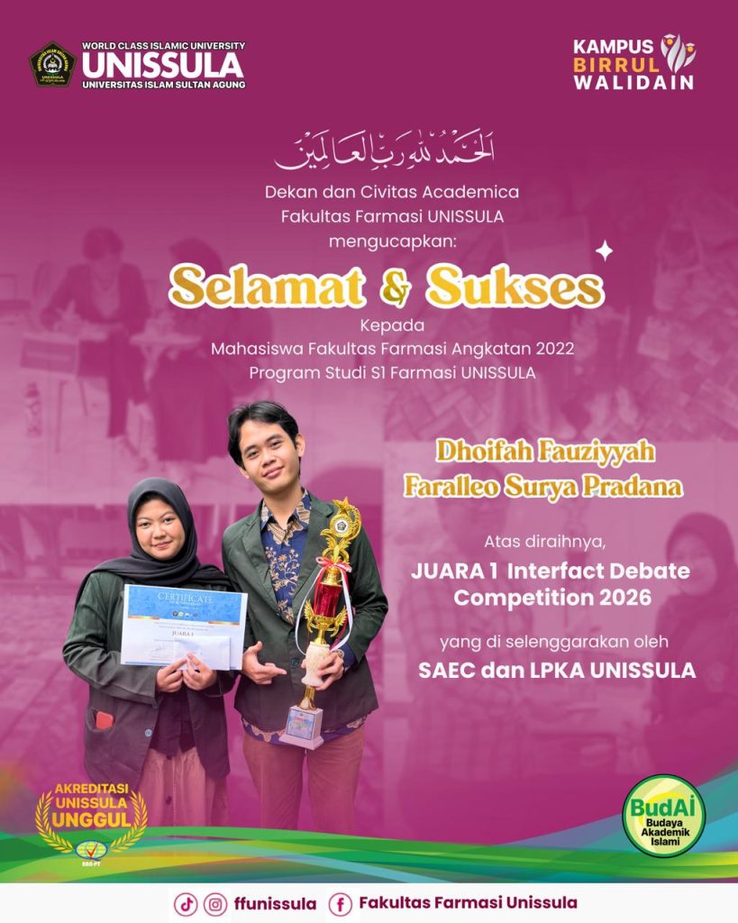 Kabar membanggakan kembali datang dari civitas akademika Fakultas Farmasi. Mahasiswa Program Studi S1 Farmasi angkatan 2022 berhasil menorehkan prestasi gemilang dengan meraih Juara 1 Interfact Debate Competition 2026, sebuah ajang kompetisi bergengsi yang mempertemukan mahasiswa dari berbagai fakultas untuk menguji kemampuan berpikir kritis, argumentasi ilmiah, serta keterampilan komunikasi publik.